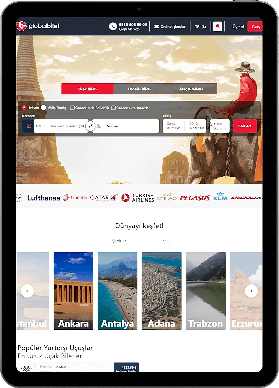 Global bilet markası online uçak bileti, otobüs bileti satın alma platformudur. Kullanıcılarının www.globalbilet.com adresinden bilet alma deneyimini kolaylaştırmak adına UI & UX testi hizmeti verilmiştir.